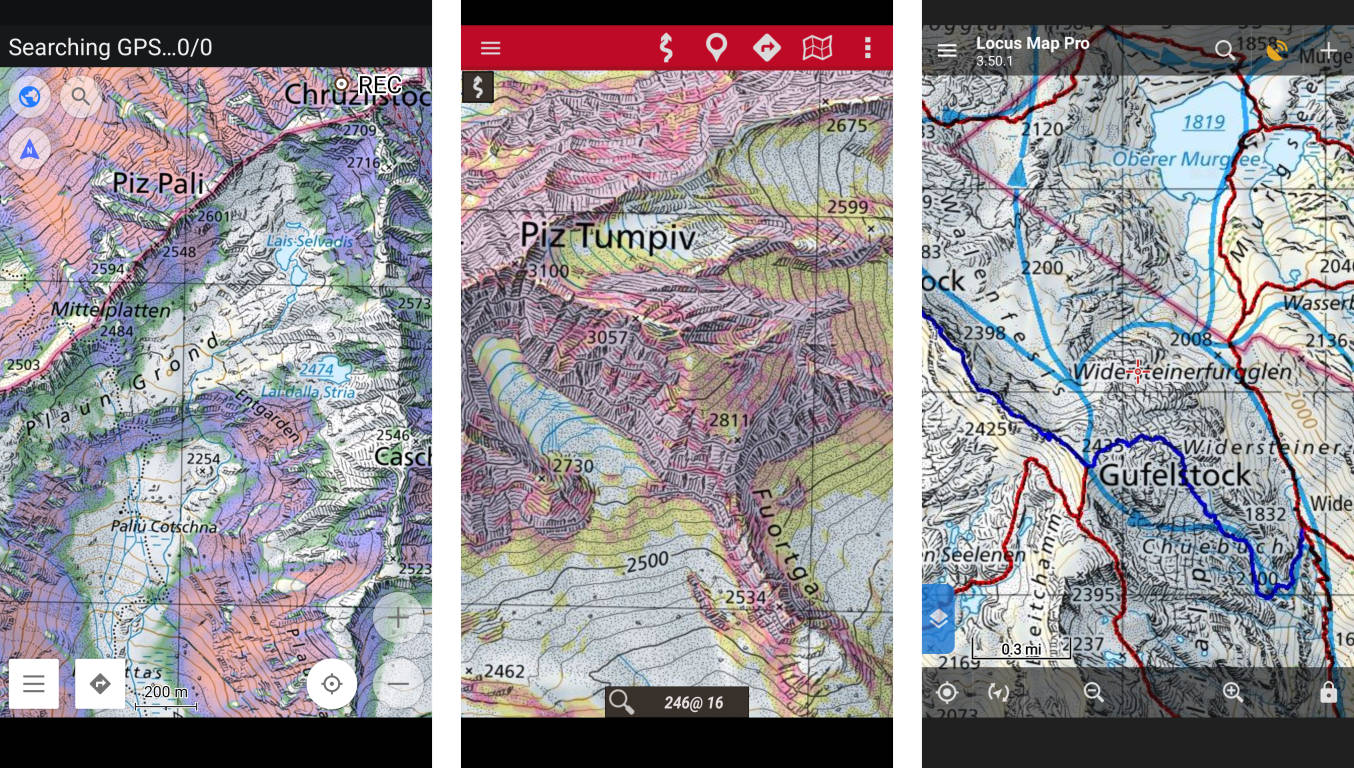 Fig. 1: Screenshots von drei exzelenten Karten-Apps: OsmAnd, Oruxmaps und LocusMap.