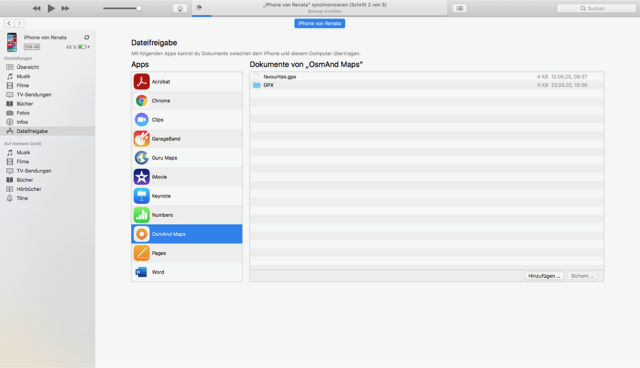 Fig. 2: Printcreen von iTunes beim Transferieren der Karten-Datei.