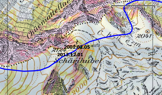 Von besonderem Interesse sind natürlich alle Unfälle, dessen zugewiesene Routen die Risiko-Kategorie "tief (grün)" aufwies. Hier ist etwas schief gelaufen. Wir wollen deshalb systematisch alle Unfälle, die näher als 40 m an einer gängigen Route liegen untersuchen. Jede Unfalllawine wird mit einer 60 m langen Falltrajektrorie (orange) beschrieben. Diese Linie startet am Lawinenanrisspunkt (höchster Punkt des Lawinenanrisses) und endet in etwa am untersten Punkt des Lawinenanrisses. In der Mitte befindet sich ein grüner Punkt, der in etwa im Zentrum des Lawinenanrisses zu liegen kommt. Die Karten zeigen auch die Routen von Skitourenguru (blau) und die Neigungskarte. Die Neigungskarte erlaubt es die Plausibilität des Unfallortes zu überprüfen. Jeder Kommentar beginnt mit dem Vermerk "Negativ" oder "Positiv". "Negativ" bedeutet, dass diesem Unfall in der Statistik wenig bzw. keine Bedeutung zukommt.